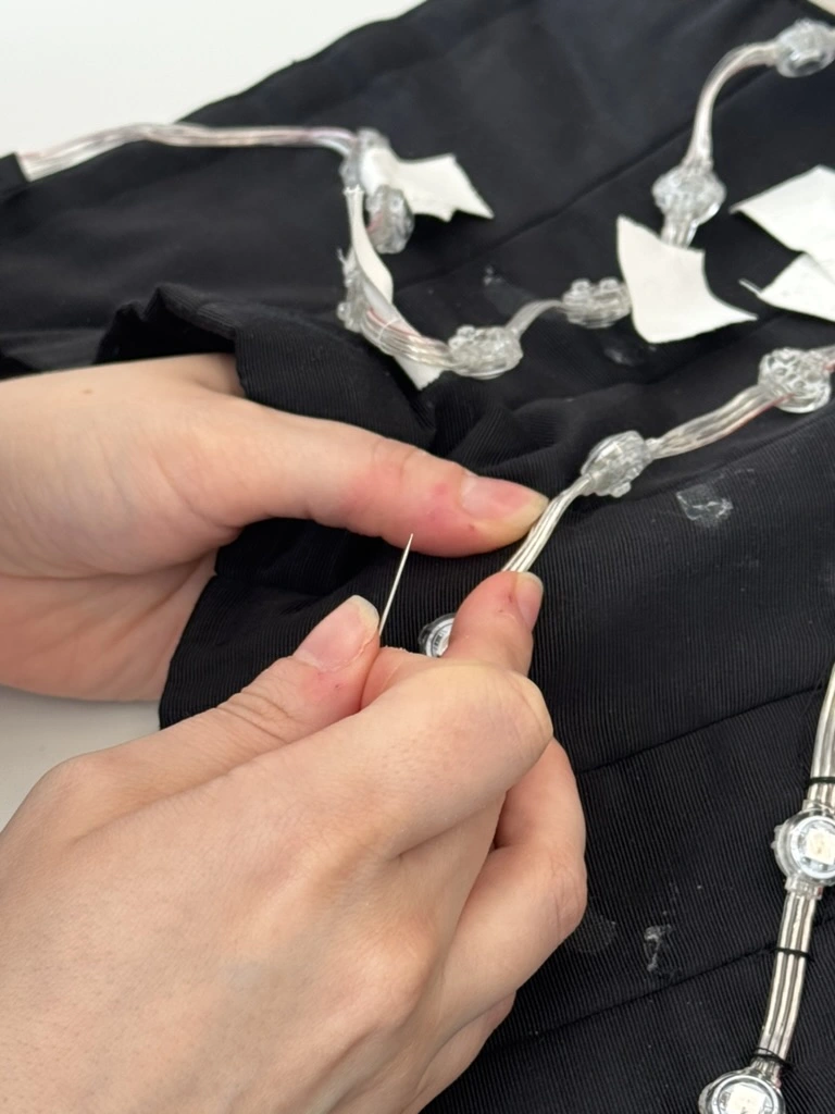 Ballet costumes must be expressive, lightweight, and durable, capable of withstanding continuous movement and intense performance demands. For this production, the creative direction introduced an additional layer of complexity. The challenge was to integrate lighting technology into garments that maintain the delicate elegance of a classical tutu.